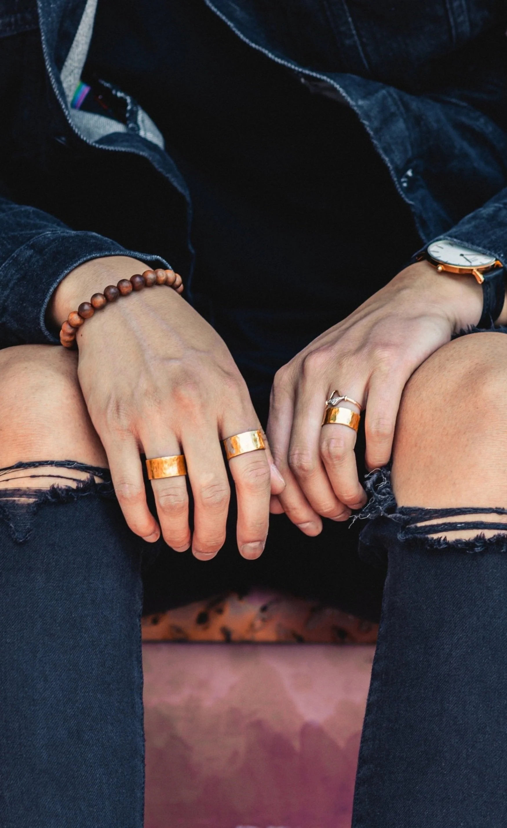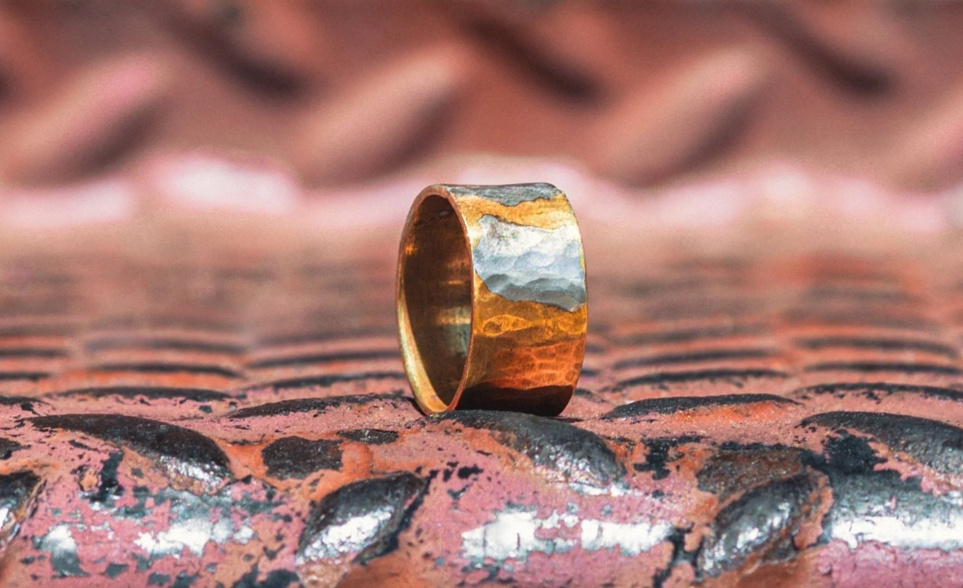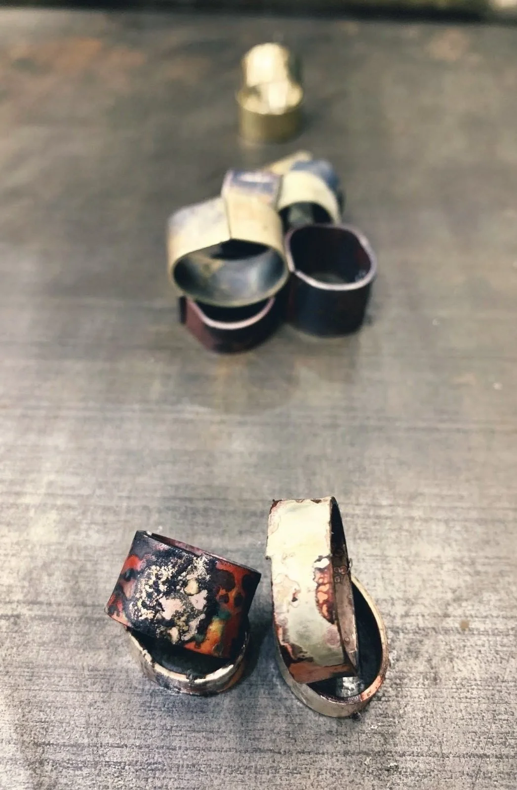 Scraps of copper metal and brass metal solder welded into finger rings. The hammered texture design giving it the name Smash.