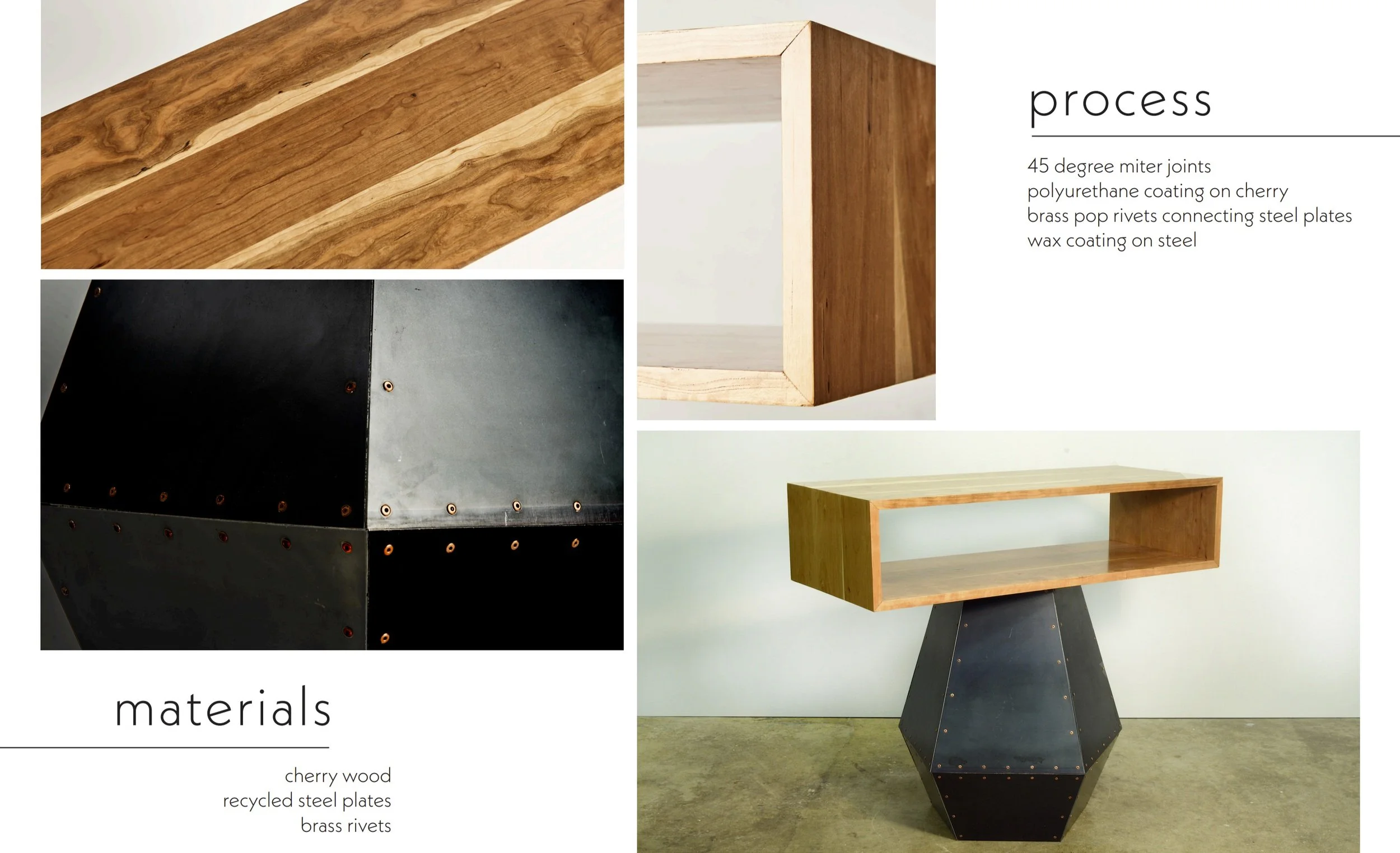 An accent table from the h.e.w. collection, a personal twist on household tables using wood and metal. Made out of ten trapezoids recycled steel plates, four 45 degree miter joint cherry wood, and one hundred and fifty brass pop rivets.